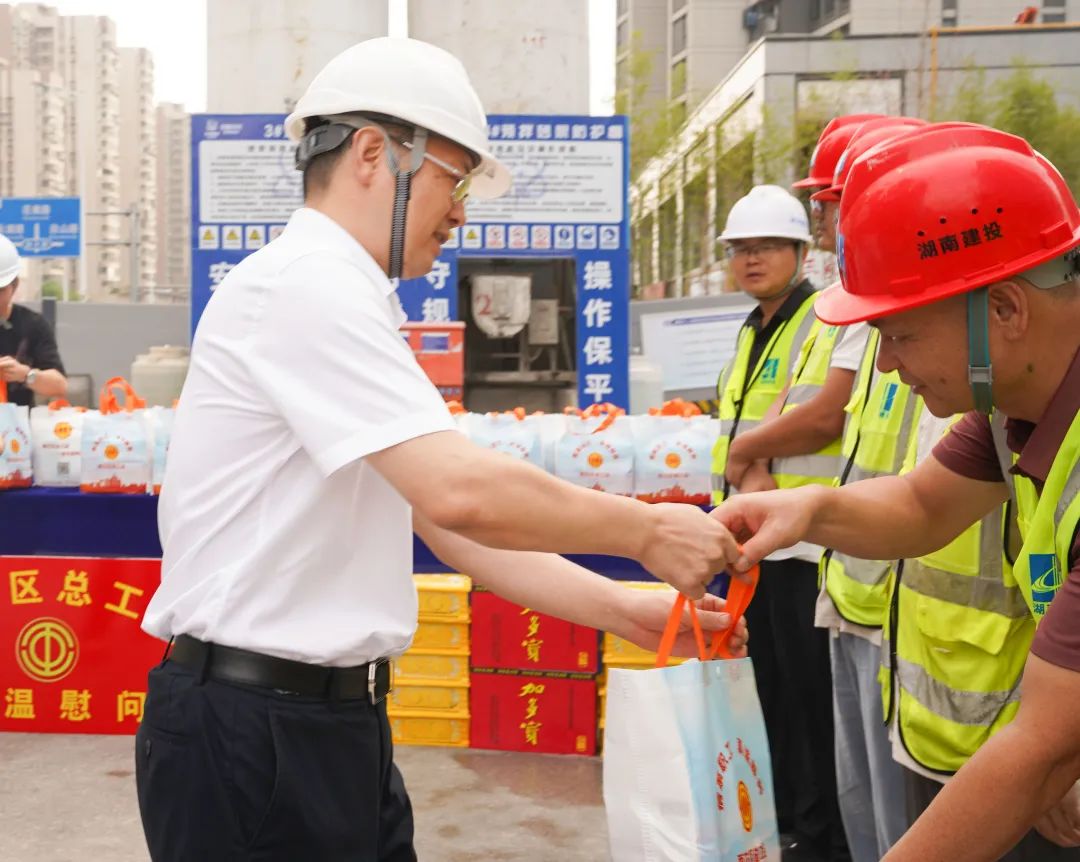 中核(长沙)肿瘤医院项目,总投资超60亿元,目前已完成一期主体结构封顶,建设现场一派繁忙,施工队伍正抓紧推进施工进度。在项目现场,黄军其详细了解项目建设情况、工人作息安排及防暑降温措施,叮嘱大家要注意施工安全、科学防暑,对大家不畏酷暑、坚守岗位表示诚挚问候和衷心感谢,并把防暑降温物资一一送到大家手中。