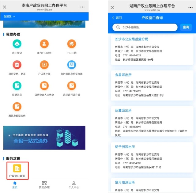 四、申请人在户口业务办理过程中,如需咨询相关业务,可在工作日(9:00—12:00,13:00—17:00)致电 0731-96305,或在湖南户政业务网上办理平台下方服务攻略中点击“户政窗口查询”,查找户籍地派出所电话进行咨询。