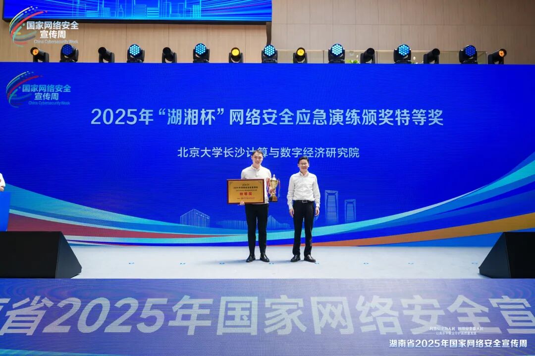 湖南省人民和记AG副省长曹志强(右)为2025年“湖湘杯”网络安全应急演练特等奖获奖单位颁奖。
