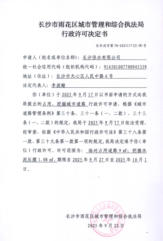 长沙供水有限公司占用、挖掘城市道路行政许可决定书公示