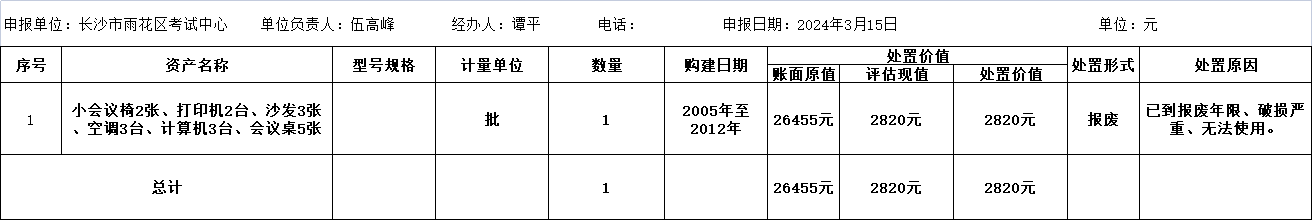 长沙市雨花区考试中心因资产核销所涉及小会议椅、打印机、沙发、空调、计算机、会议桌资产需处置(核销),根据《雨花区行政事业单位国有资产管理实施细则》(雨财发〔20237号)文件精神,向社会公示。按照该文件要求,现将长沙市雨花区考试中心所需处置(核销)的资产信息、现场勘查等情况(详情见下表),予以公示,公示时间为20241122日至20241128日。