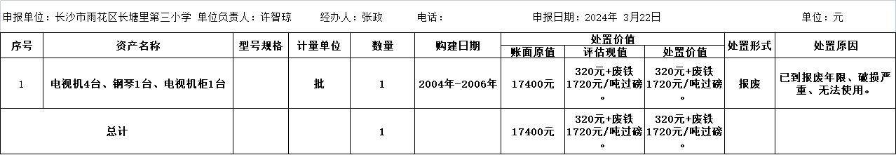 长沙市雨花区长塘里第三小学因资产核销所涉及电视机、钢琴、电视机柜资产需处置(核销),根据《雨花区行政事业单位国有资产管理实施细则》(雨财发〔20237号)等文件精神,向社会公示。按照该文件要求,现将长沙市雨花区长塘里第三小学所需处置(核销)的资产信息、现场勘查等情况(详情见下表),予以公示,20241122日至20241128。