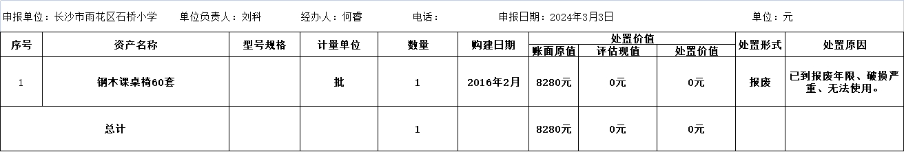 长沙市雨花区石桥小学因资产核销所涉及钢木课桌椅资产需处置(核销),根据《雨花区行政事业单位国有资产管理实施细则》(雨财发〔20237号)等文件精神,向社会公示。按照该文件要求,现将长沙市雨花区石桥小学所需处置(核销)的资产信息、现场勘查等情况(详情见下表),予以公示,公示时间为20241122日至20241128。