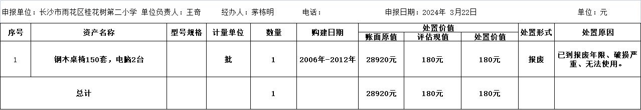 长沙市雨花区桂花树第二小学因资产核销所涉及钢木桌椅、电脑资产需处置(核销),根据《雨花区行政事业单位国有资产管理实施细则》(雨财发〔20237号)等文件精神,向社会公示。按照该文件要求,现将长沙市雨花区桂花树第二小学所需处置(核销)的资产信息、现场勘查等情况(详情见下表),予以公示,公示时间为20241122日至20241128。