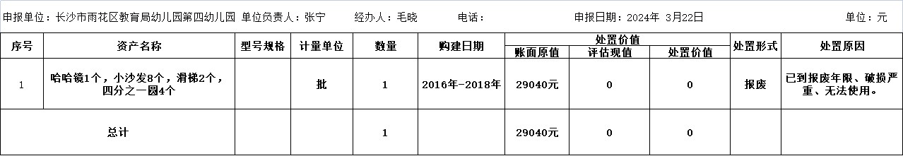 长沙市雨花区教育局幼儿园第四幼儿园因资产核销所涉及哈哈镜、小沙发、滑梯、四分之一圆资产需处置(核销),根据《雨花区行政事业单位国有资产管理实施细则》(雨财发〔20237号)等文件精神,向社会公示。按照该文件要求,现将长沙市雨花区教育局幼儿园第四幼儿园所需处置(核销)的资产信息、现场勘查等情况(详情见下表),予以公示,20241122日至20241128。