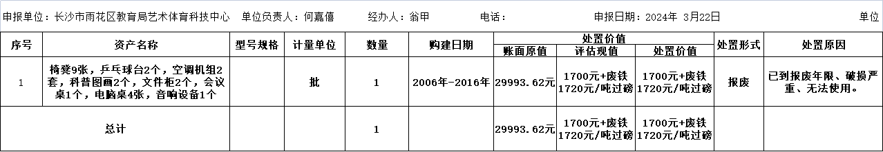 长沙市雨花区教育局艺术体育科技中心因资产核销所涉及椅凳、乒乓球台、空调机组、科普图画、文件柜、会议桌、电脑桌、音响设备资产需处置(核销),根据《雨花区行政事业单位国有资产管理实施细则》(雨财发〔20237号)等文件精神,向社会公示。按照该文件要求,现将长沙市雨花区教育局艺术体育科技中心所需处置(核销)的资产信息、现场勘查等情况(详情见下表),予以公示,20241122日至20241128。