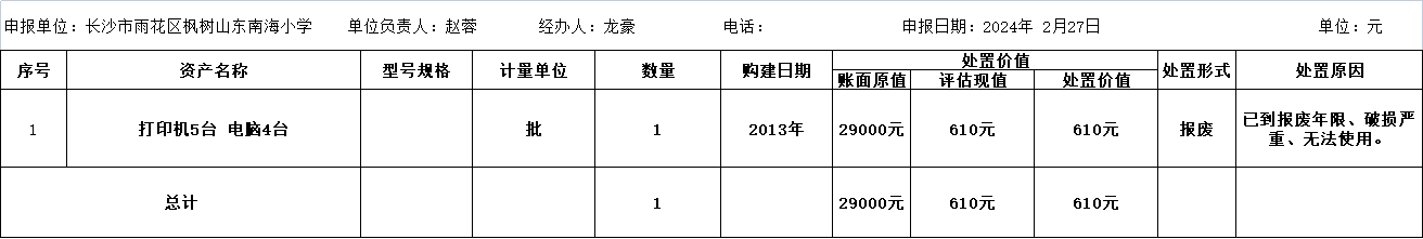 长沙市雨花区枫树山东南海小学因资产核销所涉及打印机、电脑资产需处置(核销),根据《雨花区行政事业单位国有资产管理实施细则》(雨财发〔20237号)等文件精神,向社会公示。按照该文件要求,现将长沙市雨花区枫树山东南海小学所需处置(核销)的资产信息、现场勘查等情况(详情见下表),予以公示,20241122日至20241128。