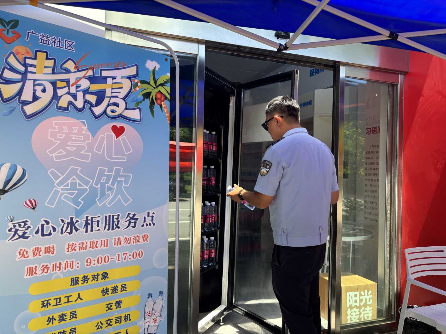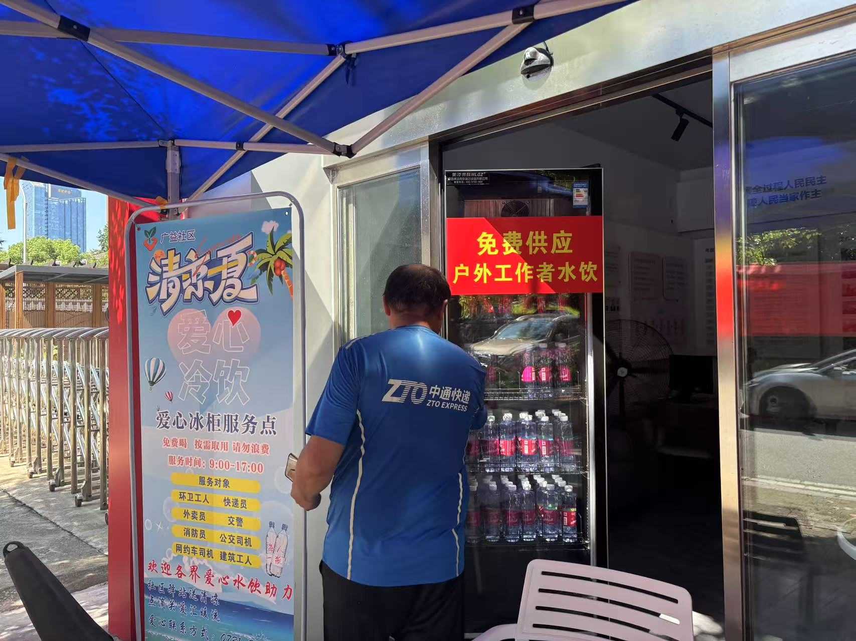 连日高温下,在湖南省长沙市雨花区黎托街道广益社区党群服务中心门前,一台醒目的红色冰箱吸引了不少户外劳动者的目光。冰箱上红色便民饮水站几个大字格外暖心,里面整齐摆放着冰镇矿泉水,供环卫工人、外卖骑手等免费取用。这是广益社区党总支联合辖区红色合伙人单位开展的"夏日送清凉"公益行动,通过党建引领、社会参与的方式,切实解决户外劳动者饮“解渴难题”